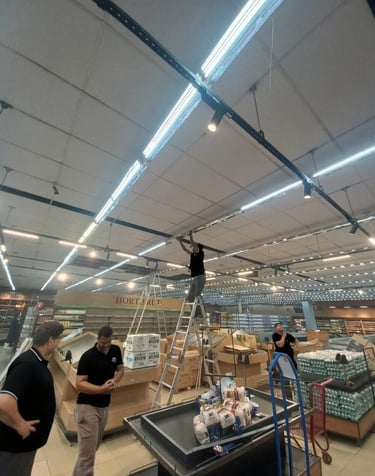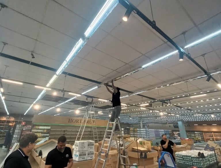 Instalação e projeto de iluminação do salão principal do hipermercado.